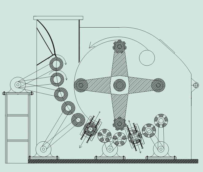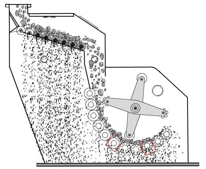 破碎物料进入粗破的形式,由粗辊与反击板相互刮削打击运动使大块物料破碎,然后进入筛分系统达到粒度要求的直接送进锅炉,未过到要求粒度的再进行到细破置进行破碎,两细破辊子相对差速运转,具有相互刮削作用而强制排料,采用原料自由落差,全进全出,对物料水分无任何要求。
